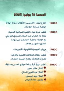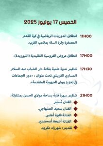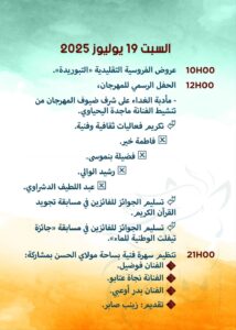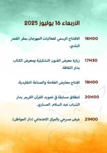 ‘و تنطلق فعاليات المهرجان يوم الأربعاء 16 يوليوز بحفل افتتاح رسمي بالقصر البلدي، يعقبه افتتاح معارض للفنون التشكيلية و الكتاب بدار الثقافة، إلى جانب معارض مخصصة للفلاحة و الصناعة التقليدية. كما يتخلل البرنامج مسابقة لتجويد القرآن الكريم و عرض مسرحي بدار المواطن،و سهرات فنية كبرى بمشاركة ألمع النجوم..