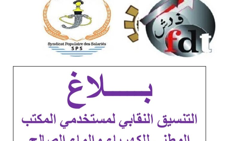 بـــــلاغ التنسيق النقابي لمستخدمي المكتب الوطني للكهرباء والماء الصالح للشرب قطاع الماء يدعو كافة المستخدمين والمستخدمات للانخراط الواسع والمسؤول في البرنامج النضالي المسطر