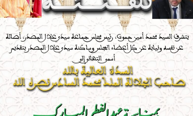 يتشرف السيد محمد أمين حموت رئيس جماعة علال المصدر أصالة عن نفسه و نيابة عن كل أعضاء المجلس و ساكنة سيدي علال المصدر بتقديم التهاني إلى السدة العالية بالله صاحب الجلالة الملك محمد السادس نصره الله بمناسبة عيد الفطر المبارك