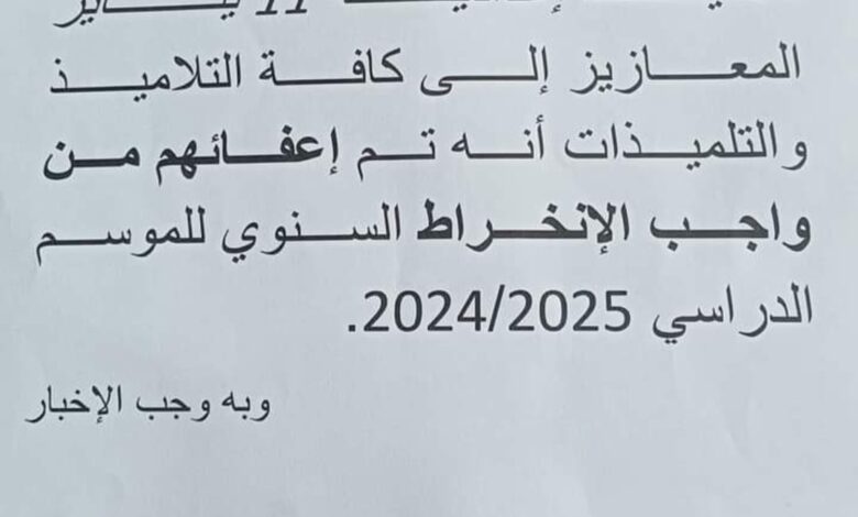 في بادرة تستحق التنويه والإشادة، قامت جمعية آباء وأمهات وأولياء التلاميذ بإعدادية 11 يناير بجماعة المعازيز إقليم الخميسات بإتخاذ خطوة ملموسة لدعم التلاميذ، حيث أعلنت الجمعية عن إعفاء التلاميذ من واجب الإنخراط السنوي للموسم الدراسي 2024/2025