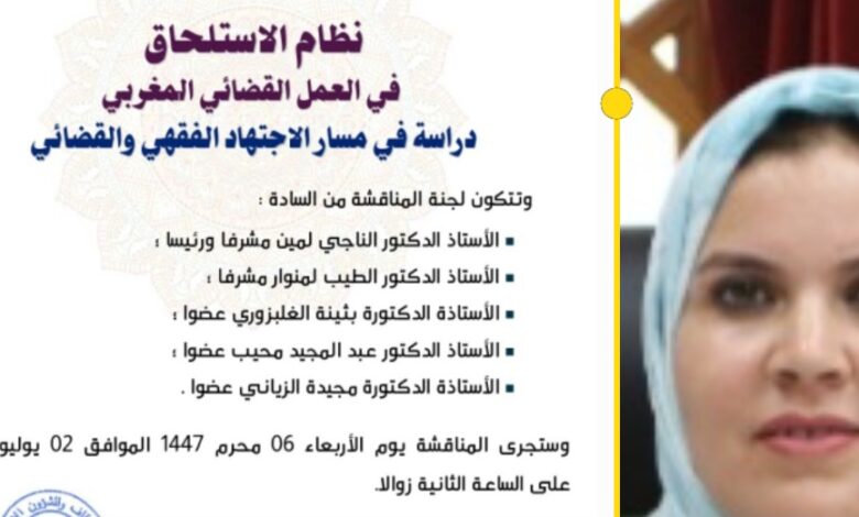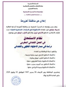 ناقشت الطالبة الباحثة والمحامية بهيئة الدار البيضاء خديجة جليلي أطروحتها لنيل شهادة الدكتوراه في الدراسات الإسلامية العليا و ذلك يوم الأربعاء 6 محرم 1447 الموافق 2 يوليوز 2025 بمؤسسة دار الحديث الحسنية، تحت عنوان نظام الاستلحاق في العمل القضائي المغربي دراسة في مسار الاجتهاد الفقهي والقضائي.
