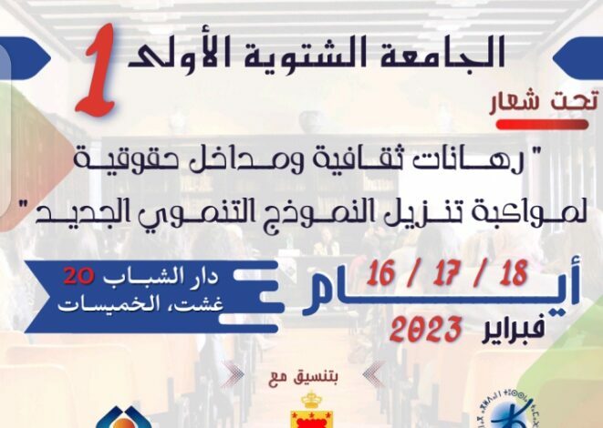 تحت شعار ” رهانات ثقافية و مداخل حقوقية لمواكبة تنزيل النموذج التنموي الجديد” تنظم جمعية مسارات تنموية بالخميسات بتعاون مع جمعية الأمل للتربية و التكوين بالخميسات و تنسيق مع المعهد الملكي للثقافة الأمازيغية و جماعة الخميسات و اللجنة الجهوية لحقوق الإنسان بالرباط- القنيطرة و المديرية الجهوية للثقافة بالرباط و جمعية الزهور للفنون الشعبية بالخميسات * الجامعة الشتوية الأولى* و ذلك أيام 16 و 17 و 18 فبراير 2023 بدار الشباب 20 غشت و داخلية ثانوية الياسمين و ثانوية عبد الله كنون بالخميسات…
