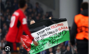 وكتب المشجع على علم فلسطين: “أوقفوا قتل أطفال غزة، فلنقف معًا”.