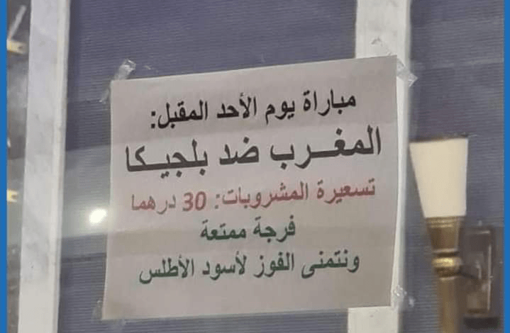 أثار انتباهي و أنا أتصفح الفايسبوك صورة صاحب إحدى المقاهي و هو يعلق إعلانا يحدد فيه ثمن تسعيرة المشروب بمناسبة مباراة المنتخب المغربي ضد المنتخب البلجيكي الذي ستجري أطواره يوم الأحد 27 نونبر 2022 في 30.00 درهما…