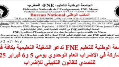 الجامعة.الوطنية.للتعليم.FNE. تدعو.الشغيلة.التعليمية.الإضراب.العام.الوحدوي.التصدي.للقانون.التكبيلي.للإضراب