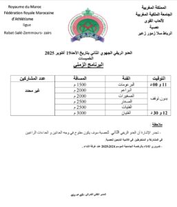 تنظم عصبة الرباط سلا زمور ازعير التابعة للجامعة الملكية المغربية لألعاب القوى يوم الأحد 19 اكتوبر 2025 بمضمار العدو الريفي:
